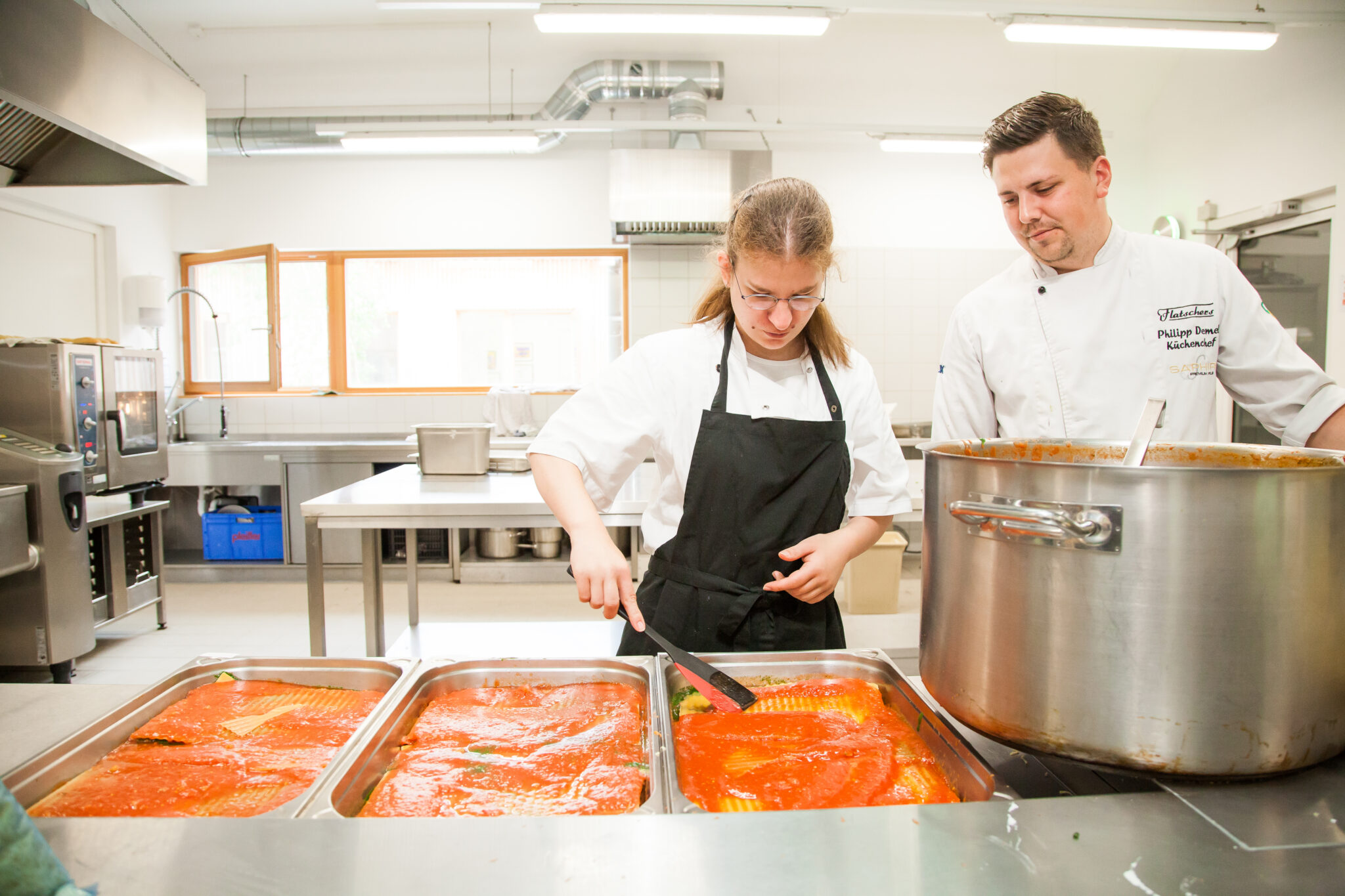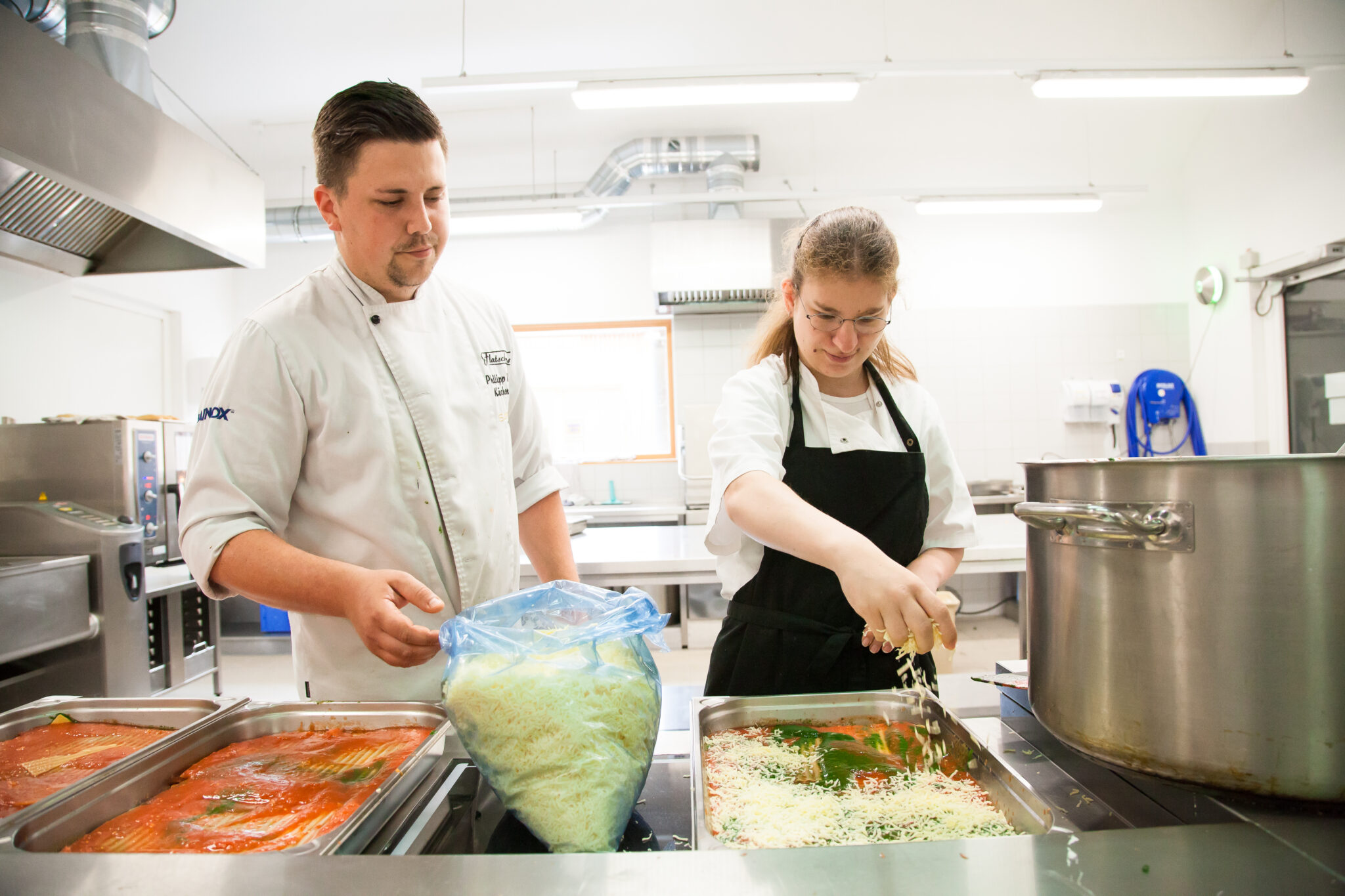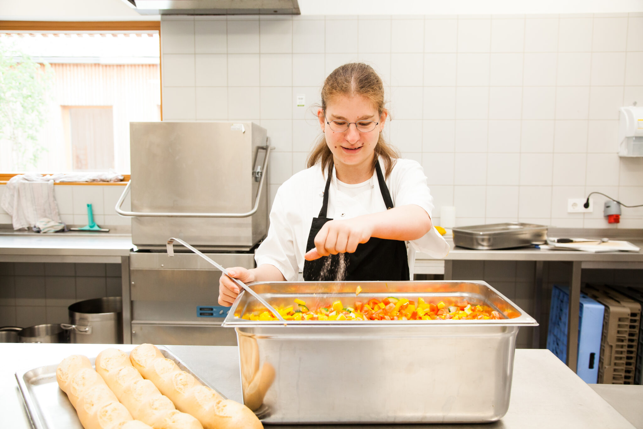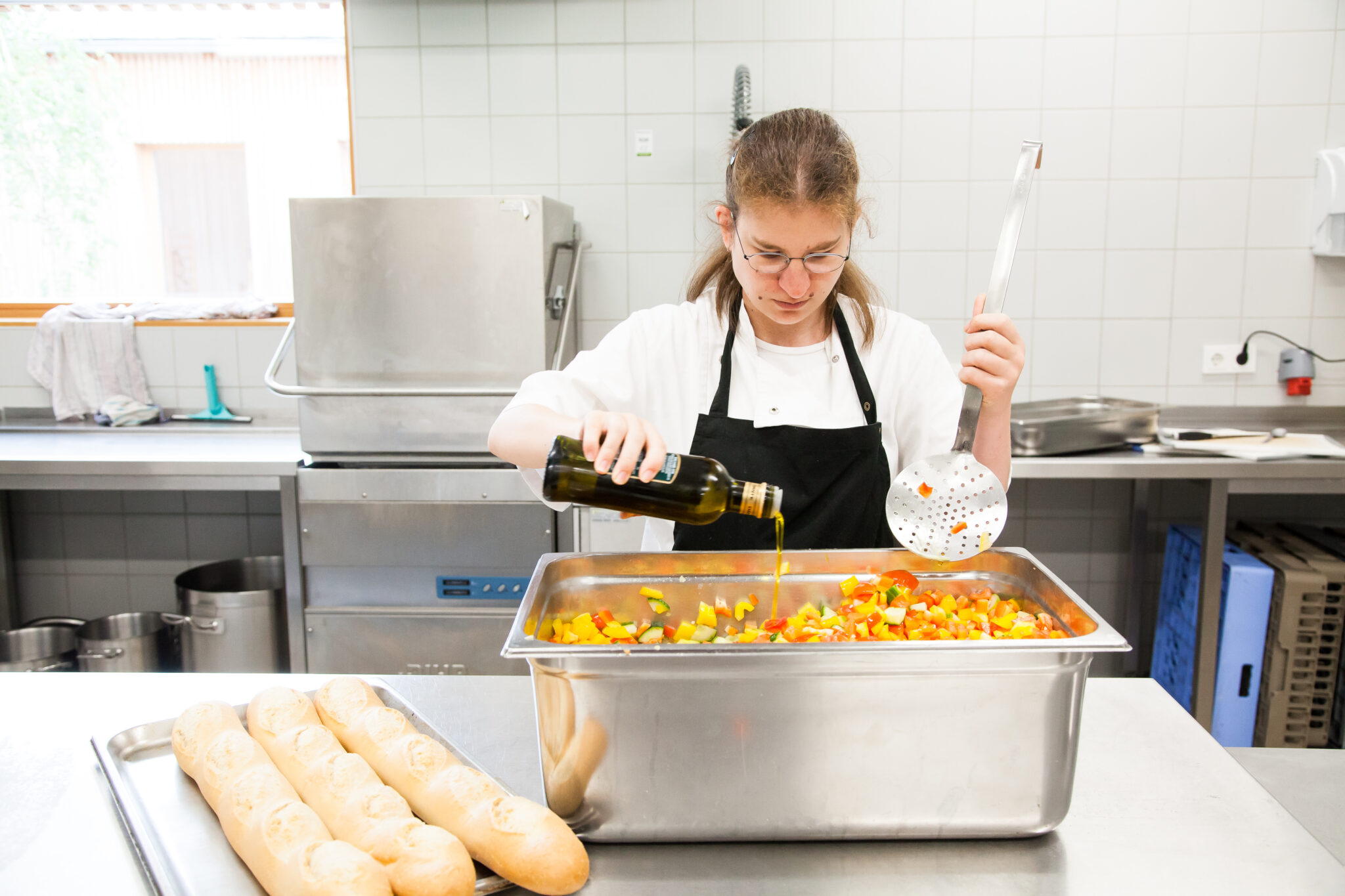 Neben dem theoretischen Fachunterricht wird in der internen Gastronomiepraxis für die Schüler:innen und Mitarbeiter:innen aller Wohn- und Ausbildungsgruppen am Standort Gänserndorf täglich ein vegetarisches Mittagsmenü gekocht sowie ein Catering für 250 Personen vorbereitet. Die Tätigkeiten hierbei sind umfangreich: